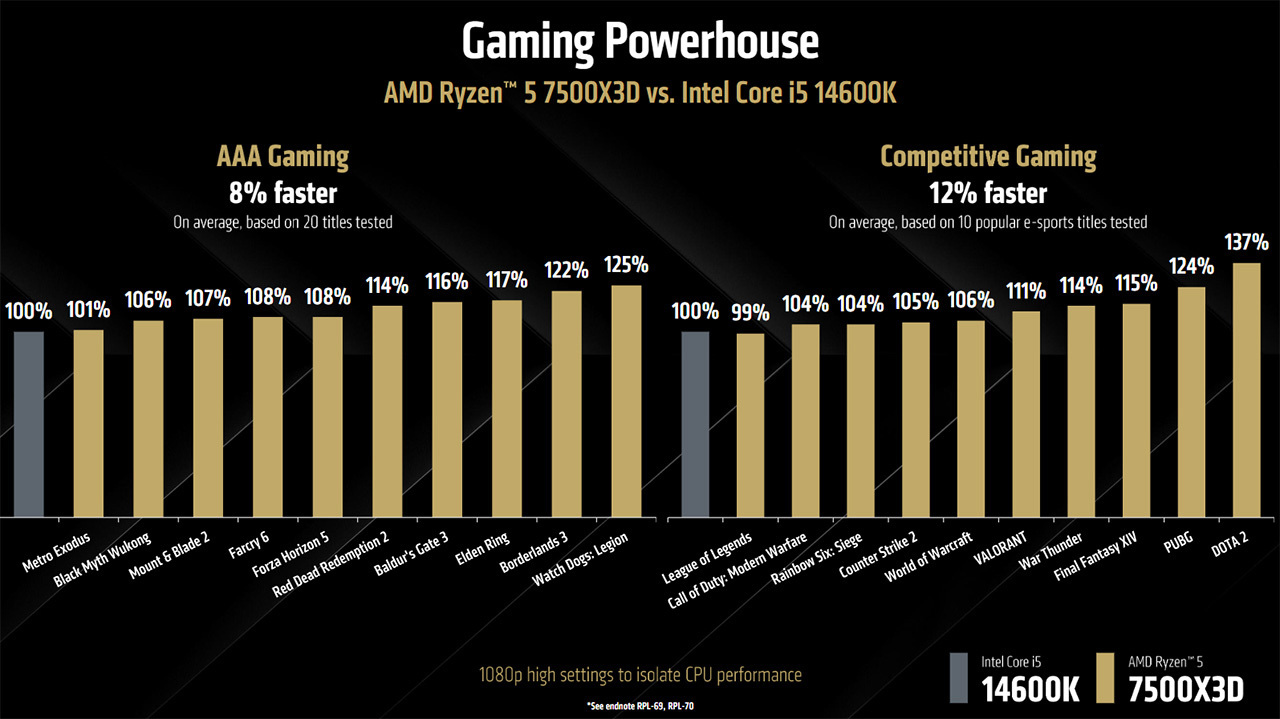 AMD sijoittaa Ryzen 5 7500X3D:n kilpailemaan Intelin Core Ultra 5 245KF -prosessoria vastaan. Yhtiön testien mukaan se peittoaa verrokkinsa 20 AA-pelin vertailussa keskimäärin 13 %:n erolla ja kilpailullisissa peleissä 10 pelin keskiarvolla 22 %:lla. Toiseksi verrokiksi on asetettu puolestaan Core i5 14600K, johon eroa tulee AAA-peleissä 8 ja kilpailullisissa peleissä 12 % AMD:n testien mukaan.